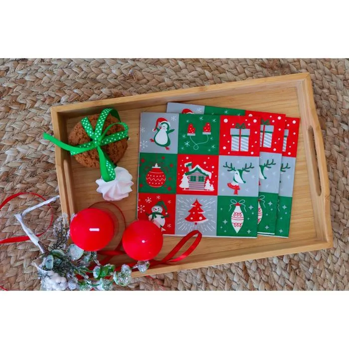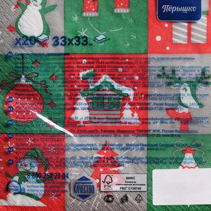 Новогодние салфетки бумажные Перышко Prestige 33х33 "Пэчворк" 3сл 20л. — Характеристики