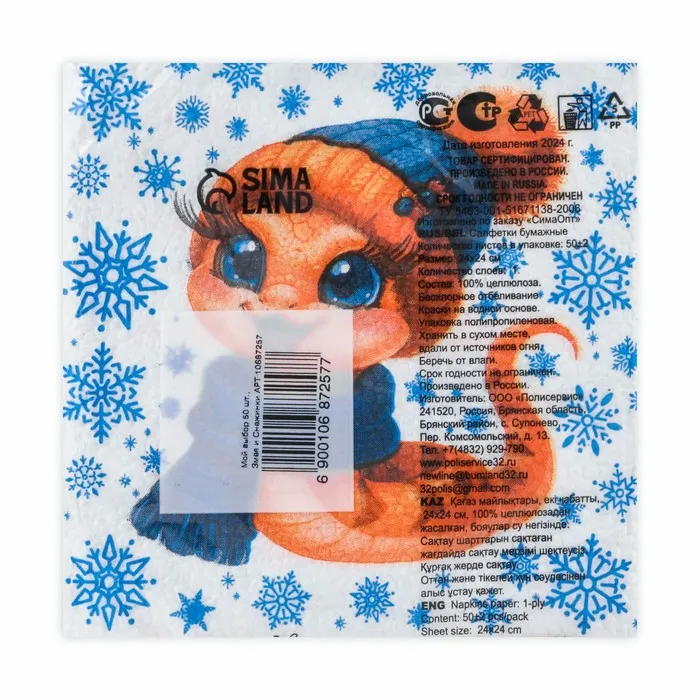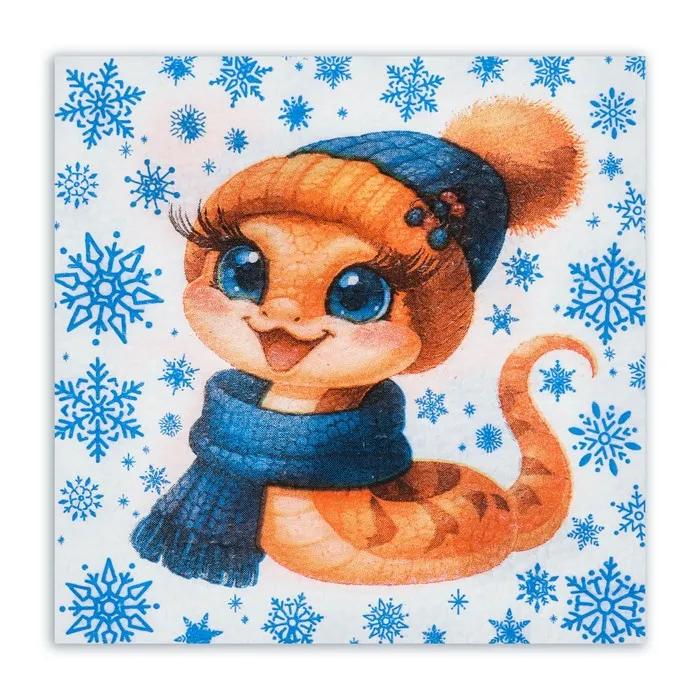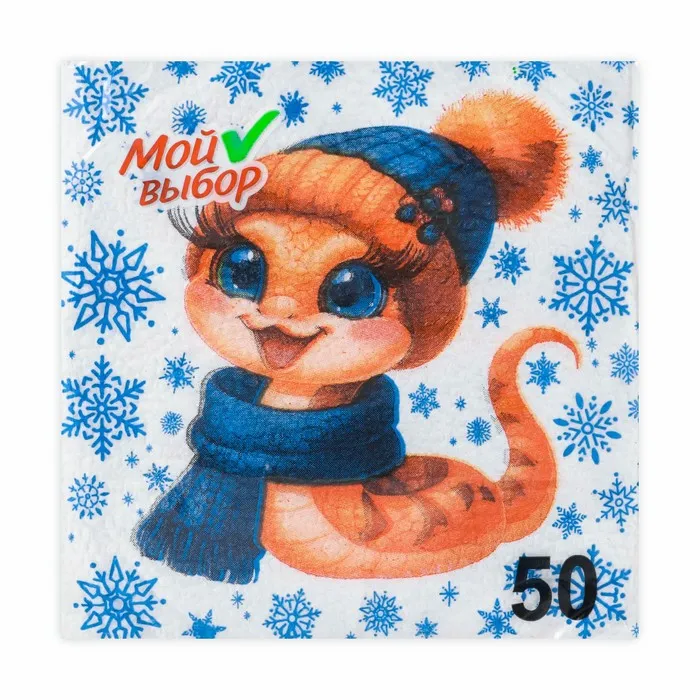 Новогодние бумажные салфетки бренда Мой выбор с рисунком "Змея и снежинки" - это отличное украшение для вашего праздничного новогоднего стола. Идеально подойдут как для сервировки, так и в качестве декора и украшения как в домашних условиях, так и на больших праздничных мероприятиях. Салфетки с уникальным рисунком будут хорошим подарком для родных и близких. Данные салфетки можно использовать так же для декупажа и коллажей.