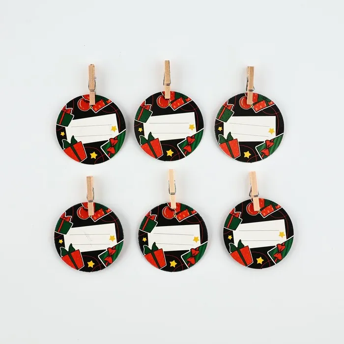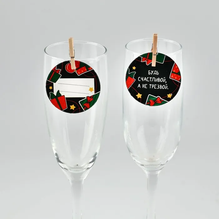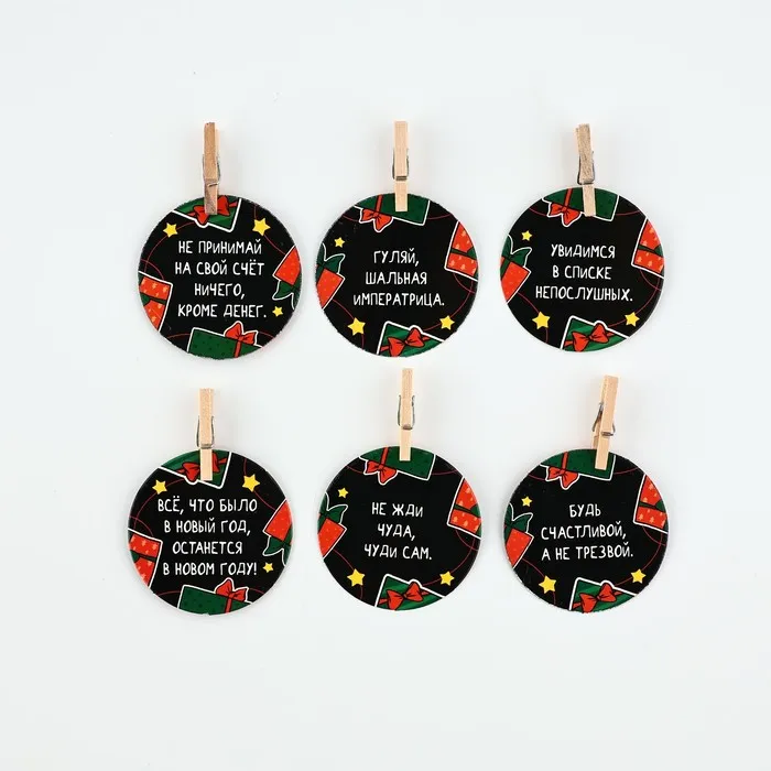 Новогодние украшения для бокалов на Новый год с пожеланиями, круг, диам. 4,5 см, 6 шт.