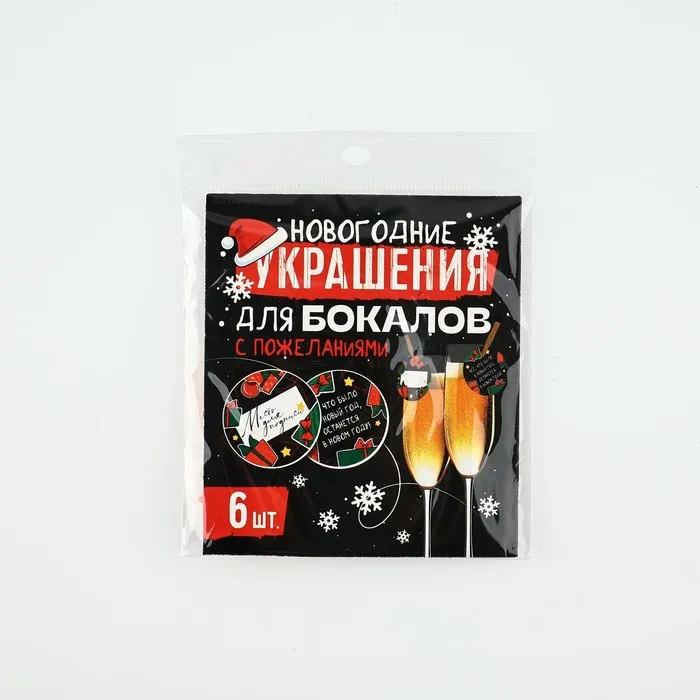 Новогодние украшения для бокалов на Новый год с пожеланиями, круг, диам. 4,5 см, 6 шт. — Характеристики