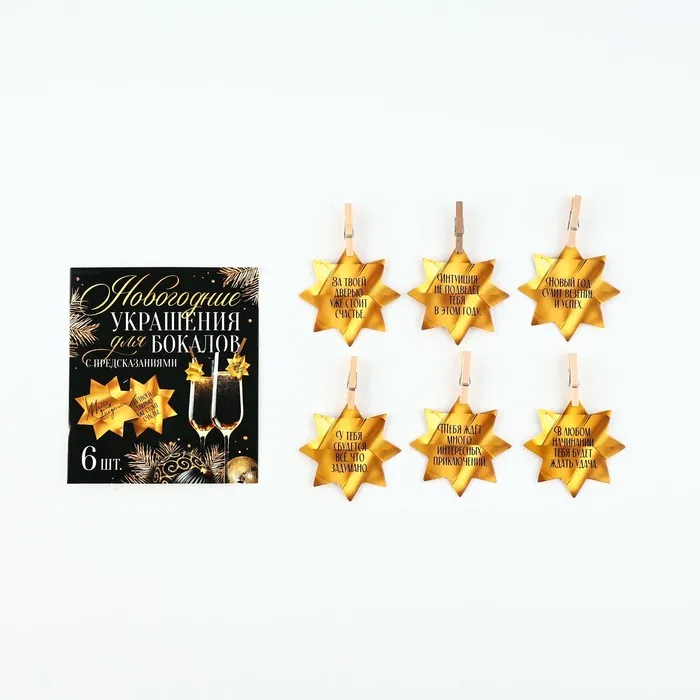 Новогодние украшения для бокалов на Новый год с предсказаниями, звёздочки, 5 х 5 см, 6 шт.