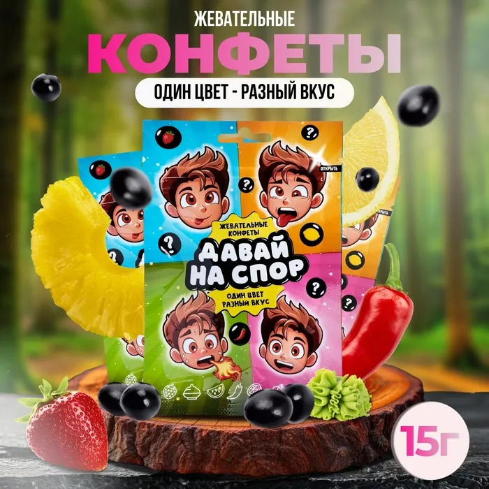 Состав: сахар, глюкозный сироп, пермеат молочный сухой, регуляторы кислотности (лимонная кислота, молочная кислота), красители (куркумин, красный свекольный), ароматизаторы.