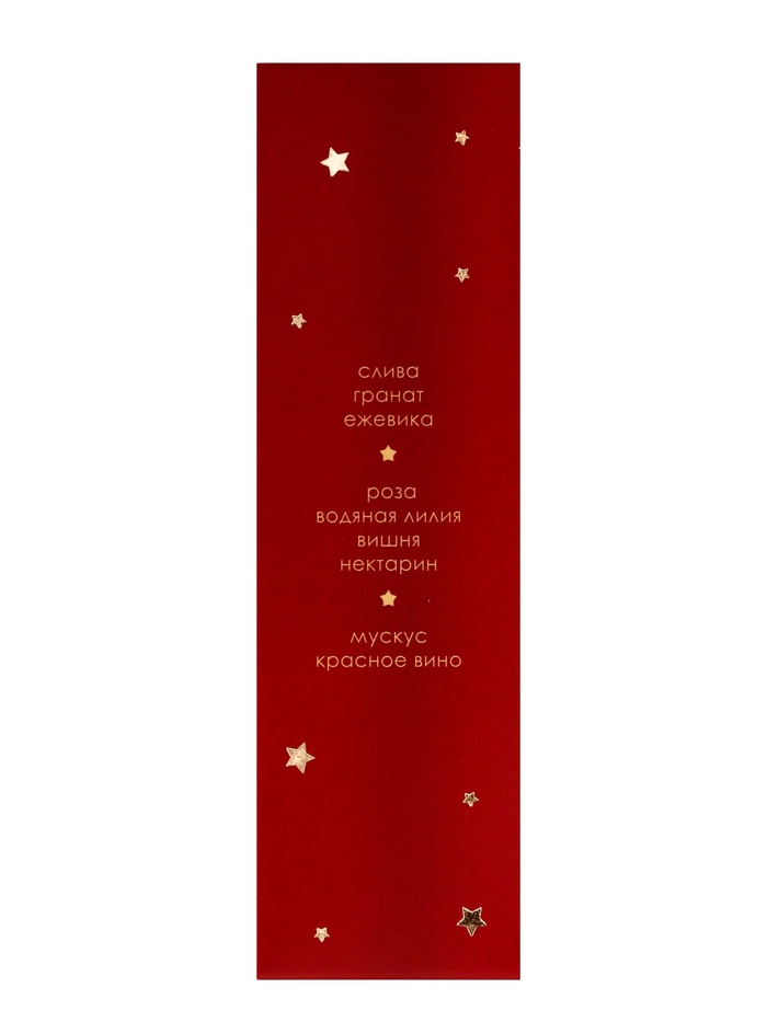 Композиция начинается с сочных нот сливы, граната и ежевики, создавая фруктовую свежесть с лёгкой кислинкой, которая бодрит и наполняет пространство жизненной энергией. Сердце аромата раскрывается богатыми цветочными и фруктовыми аккордами — розы, водяной лилии, вишни и нектарина, придавая композиции глубину, сладость и элегантность. Базовые ноты мускуса и красного вина создают чувственный шлейф, оставляющий ощущение тепла, комфорта и легкой роскоши — словно вечер у камина с бокалом вина в руках.