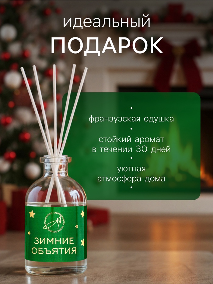 Флакон выполнен в лаконичном зимнем стиле, а праздничная открытка делает диффузор идеальным подарком для родных, друзей или коллег. Он не только украшает интерьер, но и наполняет дом атмосферой тепла, уюта и душевного комфорта в холодное зимнее время.