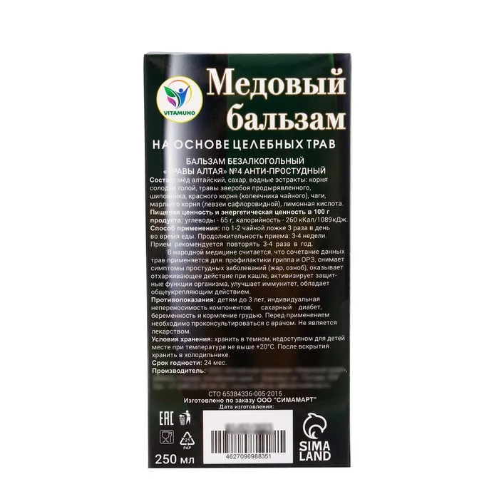 Новогодний безалкогольный алтайский медовый бальзам на травах Vitamuno «Анти-простудный», 250 мл — Характеристики