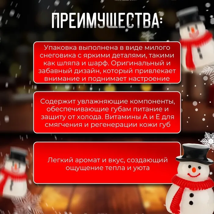 - Упаковка выполнена в виде милого снеговика с яркими деталями, такими как шляпа и шарф. Оригинальный и забавный дизайн, который привлекает внимание и поднимает настроение.