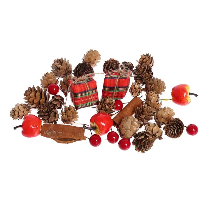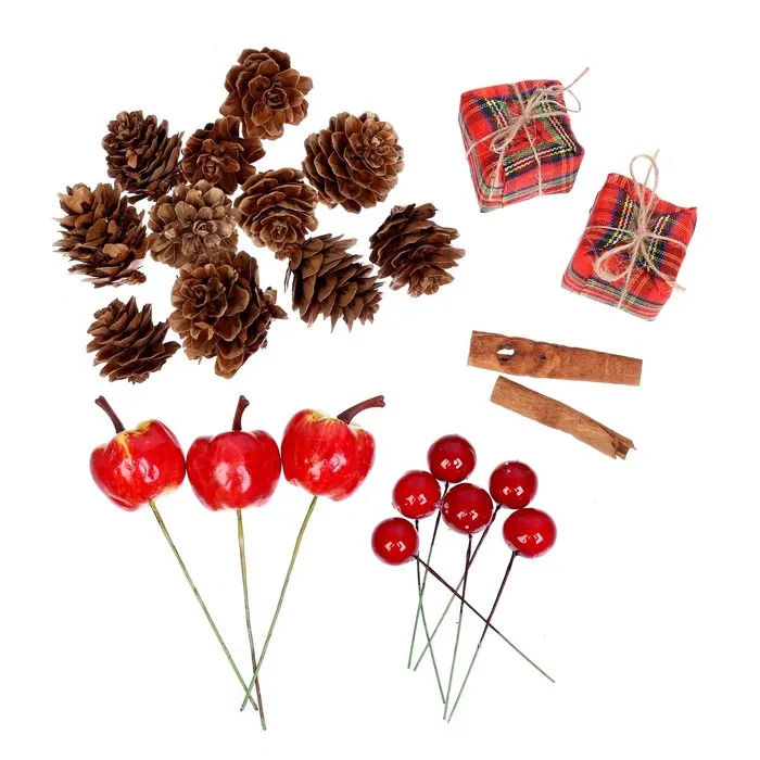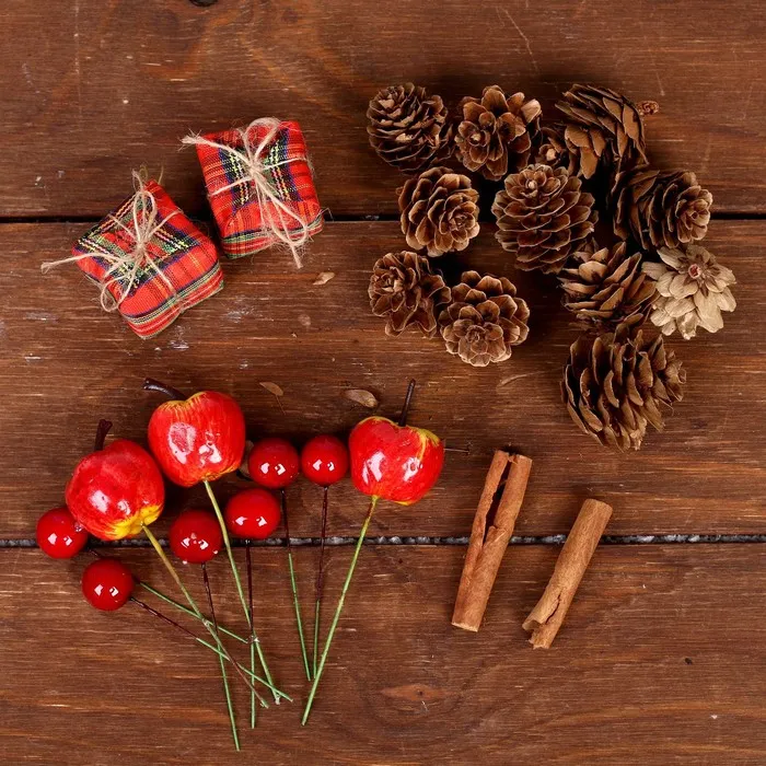 - Сделайте букет из еловых веток и декорируйте его элементами из набора.