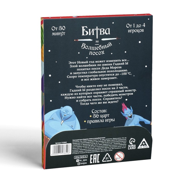 Этот Новый год может изменить всё... Злой волшебник по имени Гадкий Ы похитил посох Деда Мороза и запустил глобальное похолодание. Скоро температура опустится до –100 °C и всё живое замерзнёт. Чтобы никто ему не помешал, Гадкий Ы разделил посох на 4 части, каждую из которых охраняет страшный монстр. Нужно найти все части, победить монстров и собрать посох. Справитесь? Тогда чего же вы ждёте?