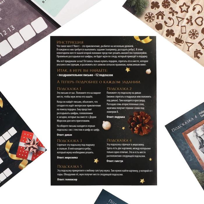 Для начала подготовьте подарок (в комплект не входит). Затем внимательно изучите все подсказки. В них вашей второй половине предстоит решить множество головоломок. Правильно разгадывая все шифры, возлюбленный будет идти по следу, который приведёт к презенту.