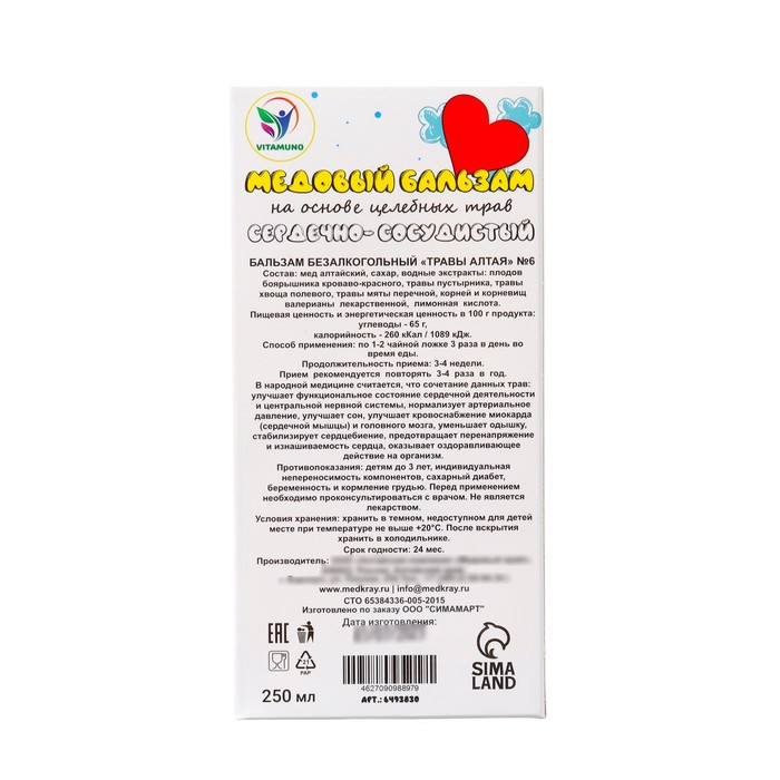 Новогодний медовый бальзам алтайский Сердечно-сосудистый Vitamuno, 250 мл — Характеристики