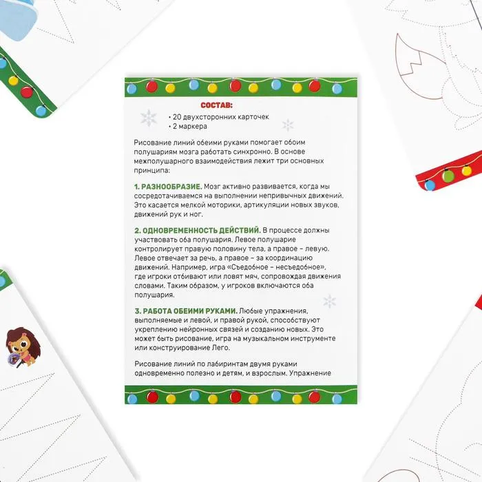Внутри малыша ждёт 20 двухсторонних карточек. На одной стороне находятся лабиринты, которые нужно пройти, используя одновременно правую и левую руки. А на другой стороне — картинки, которые нужно нарисовать обеими руками сразу. Это целых 40 заданий на развитие межполушарных связей!