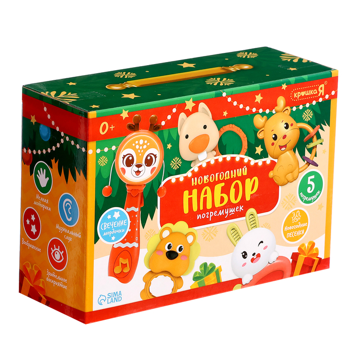 Новогодний набор погремушек с русской озвучкой и световыми эффектами станет идеальным подарком для малышей с первых дней жизни. Этот яркий комплект из 5 разноцветных погремушек поможет создать атмосферу праздника и увлечь ребёнка игрой, которая будет полезной и безопасной.