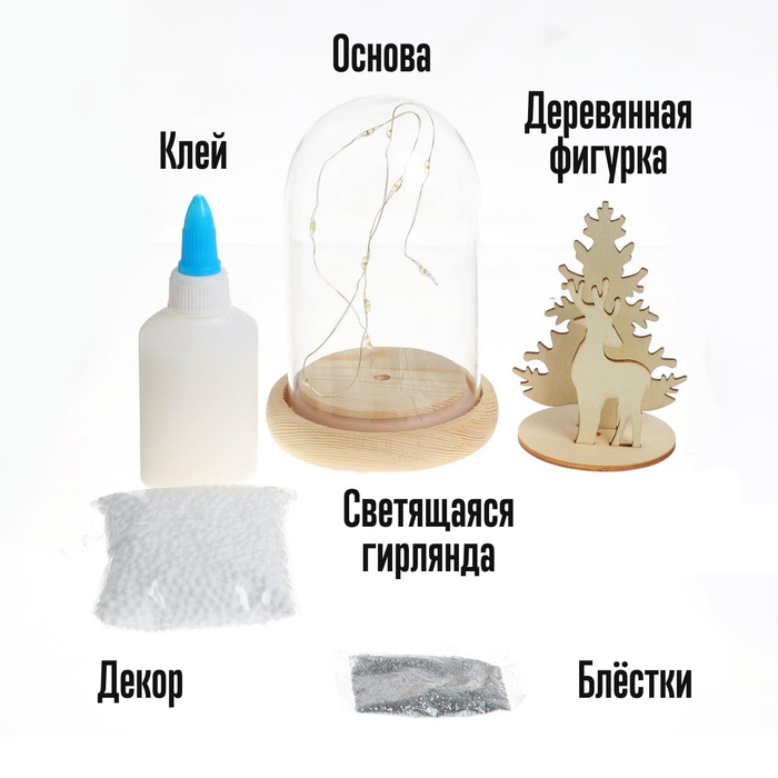В наборе: деревянная основа-подставка, прозрачный купол, детали для фигурки, клей, блёстки, искусственный снег, светящаяся гирлянда.