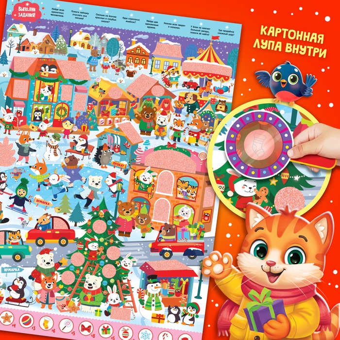 Новогодний плакат с секретами и волшебной лупой создана для чудесных открытий! Наведи лупу на картинку, реши задания и узнай все новогодние тайны!