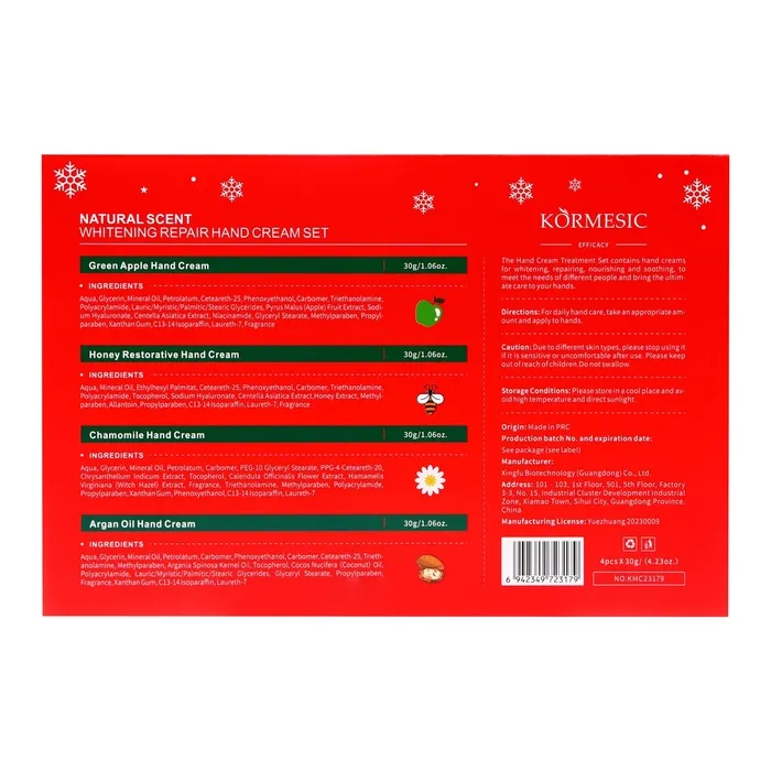 Подарите своим близким мгновения заботы и уюта с нашим эксклюзивным Новогодним подарочным набором! В стильной праздничной упаковке скрываются четыре роскошных крема для рук по 30 мл, каждый из которых создан с использованием лучших природных компонентов: сочное яблоко, натуральный мёд, нежная ромашка и питательное аргановое масло.