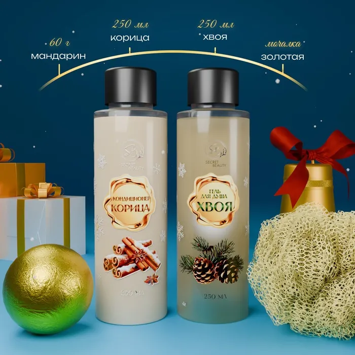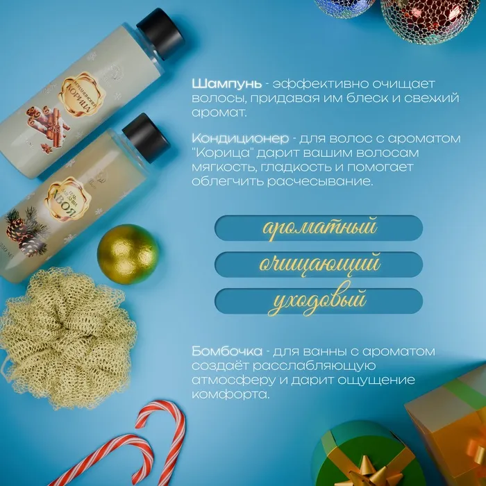 Новогодний подарочный набор косметики «Новогодние чудеса», с ароматом хвои и корицы. Золотая серия — Характеристики