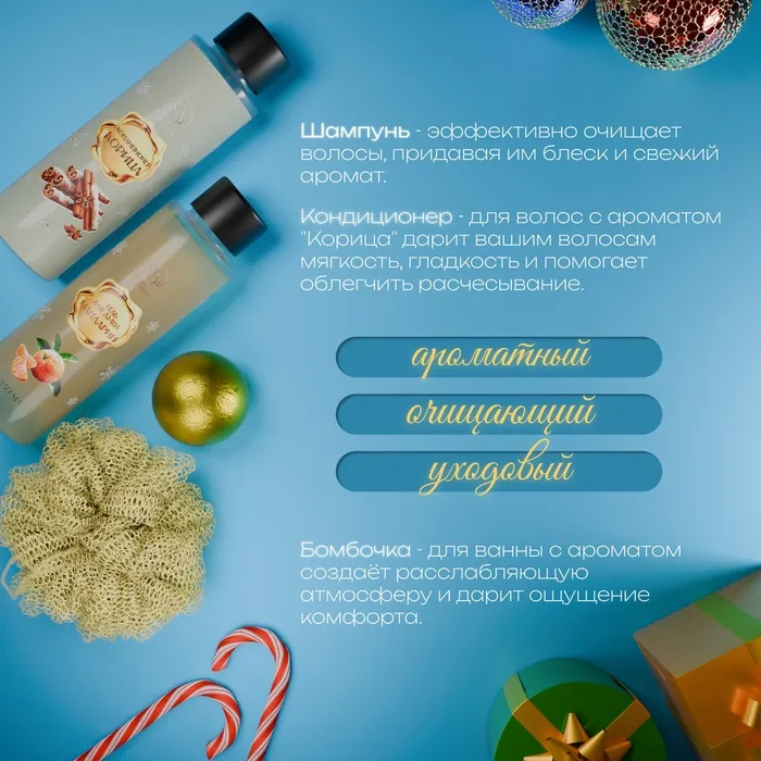 - Кондиционер 250 мл "Корица" — его нежная текстура мягко очищает кожу, создавая приятные ощущения свежести и комфорта. Ароматный шлейф геля наполняет душу ощущением праздника, а кожа остаётся увлажнённой и бархатистой на ощупь.