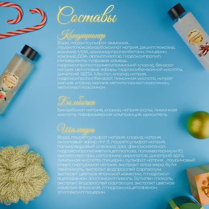 Новогодний подарочный набор косметики «Новогодние чудеса», с ароматом мандарина и корицы. Золотая серия — Характеристики