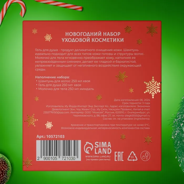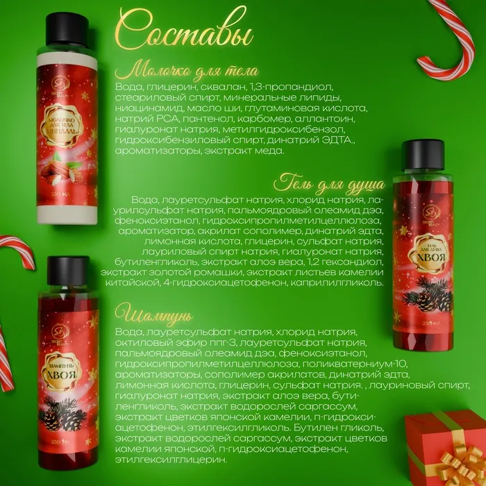 Новогодний подарочный набор косметики «Новогодние огни», с ароматом миндаля и хвои. Красная серия. — Характеристики