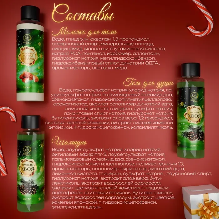 Новогодний подарочный набор косметики «Новогодние огни», с ароматом миндаля и хвои. Зеленая серия — Характеристики