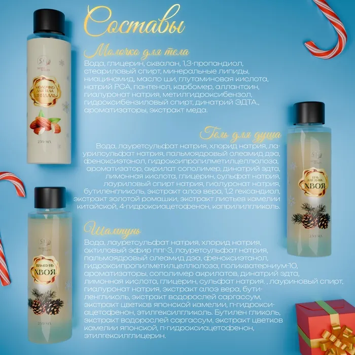 Новогодний подарочный набор косметики «Новогодние огни», с ароматом миндаля и хвои. Золотая серия — Характеристики