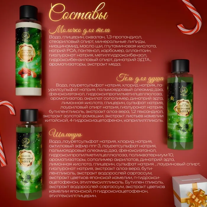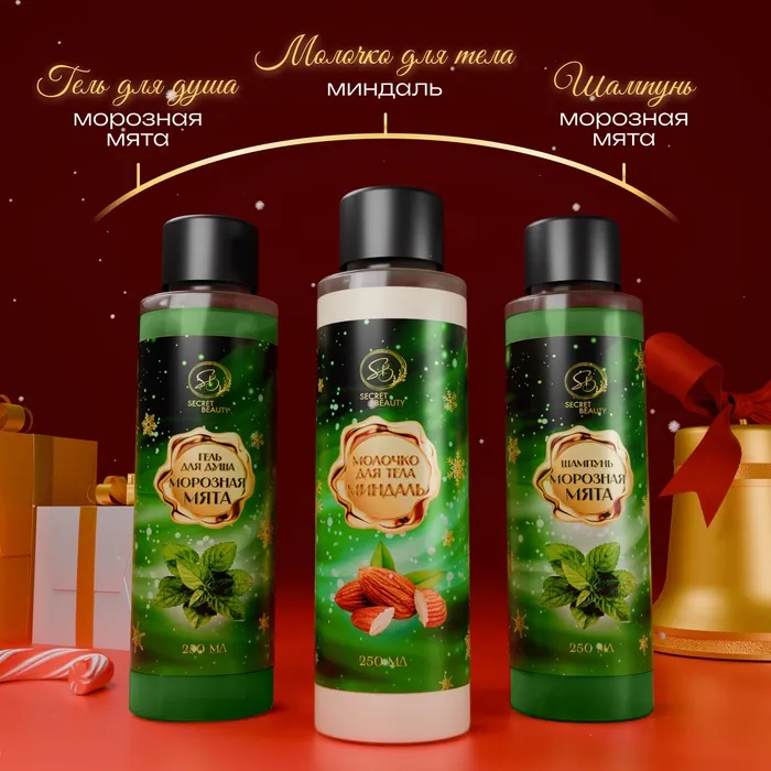 Новогодний подарочный набор косметики «Новогодние огни», с ароматом миндаля и мяты. Зеленая серия — Характеристики