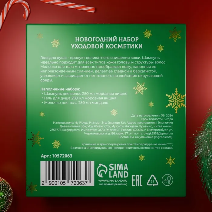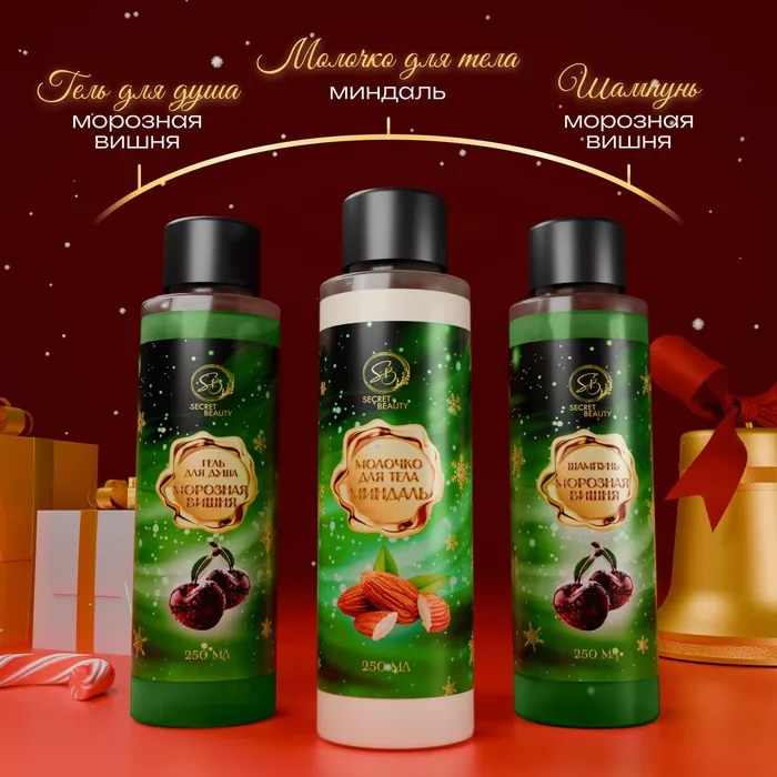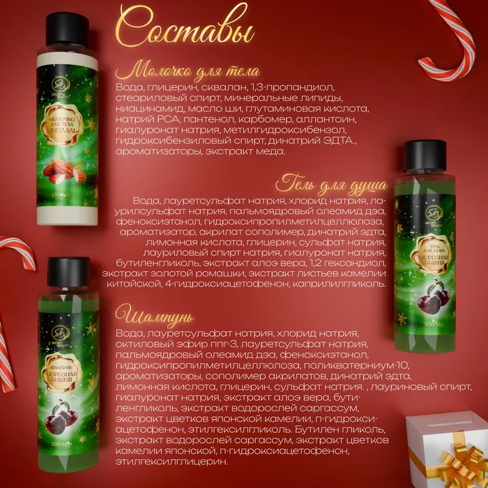 Новогодний подарочный набор косметики «Новогодние огни», с ароматом миндаля и вишни. Зеленая серия — Характеристики