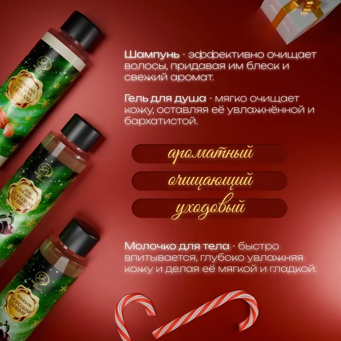 Этот набор станет отличным новогодним подарком, который подойдет как для мужчин, так и для женщин. Он обеспечит полный уход за кожей и волосами, оставляя приятное послевкусие аромата. Прекрасно подходит для зимнего ухода и создания уюта в холодные дни, а также станет отличным аксессуаром для новогодних праздников.