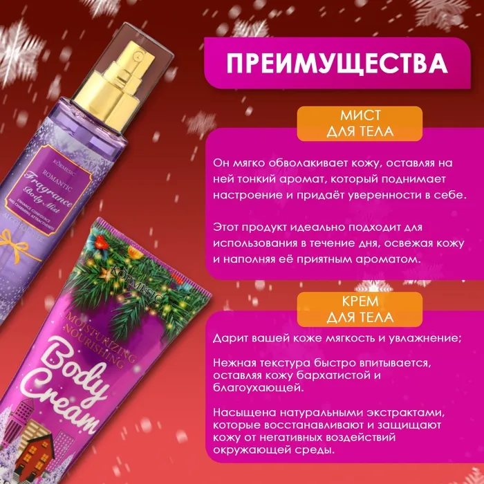 Новогодний набор "Романтика" — это идеальный подарок для тех, кто ценит нежность и заботу о себе. Этот утончённый набор включает в себя крем для тела и мист для тела, который подарит вам неповторимое ощущение свежести и лёгкости.