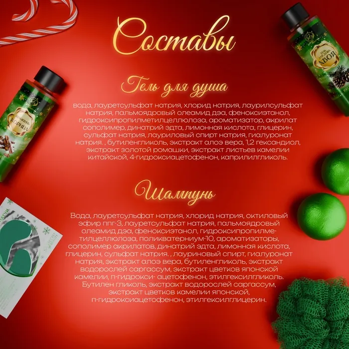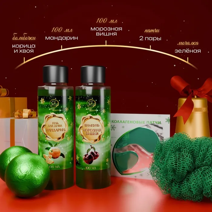 - Шампунь для волос с ароматом, 100 мл — заботится о волосах, придавая им свежесть и блеск, а также погружая в атмосферу зимнего праздника.