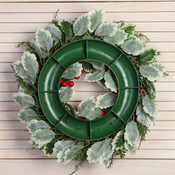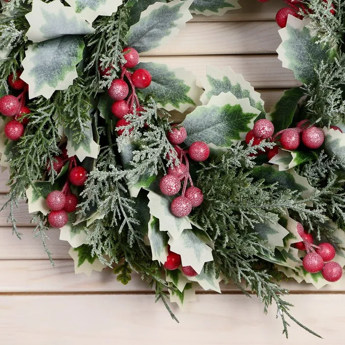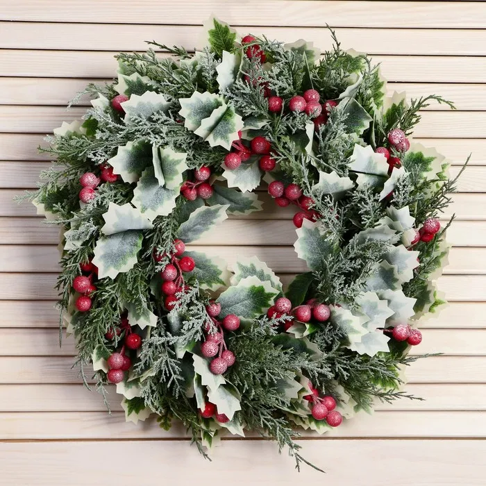 Новогодний венок d- 33 см «Зимнее волшебство. Уютная сказка» на дверь, на стену, декор листочки, ягоды, зелень — Характеристики