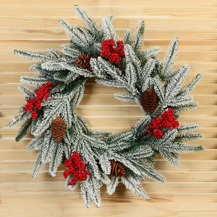 - Форма — венок, удобный для размещения на двери, стене или как часть ёлочного декора.