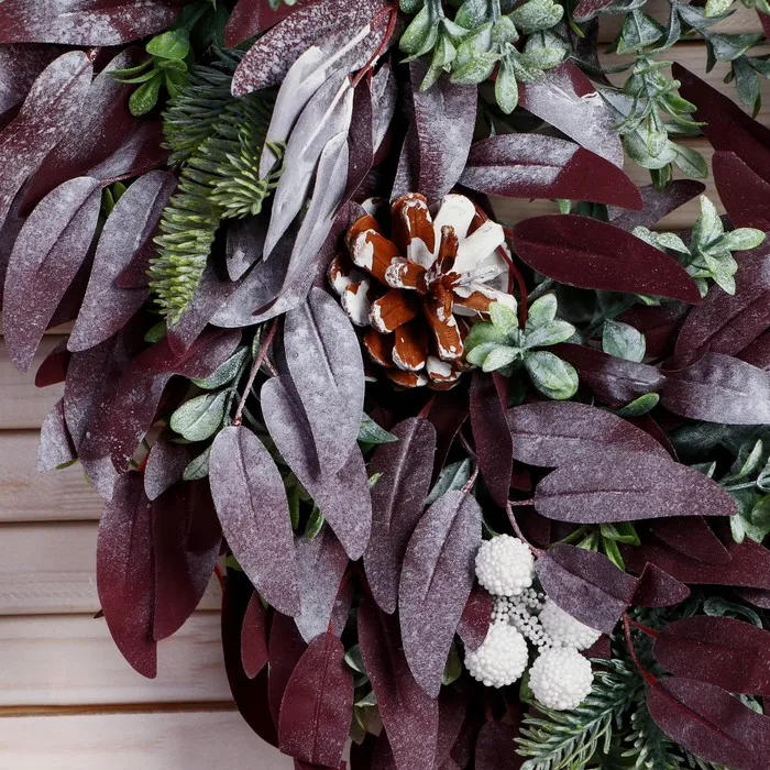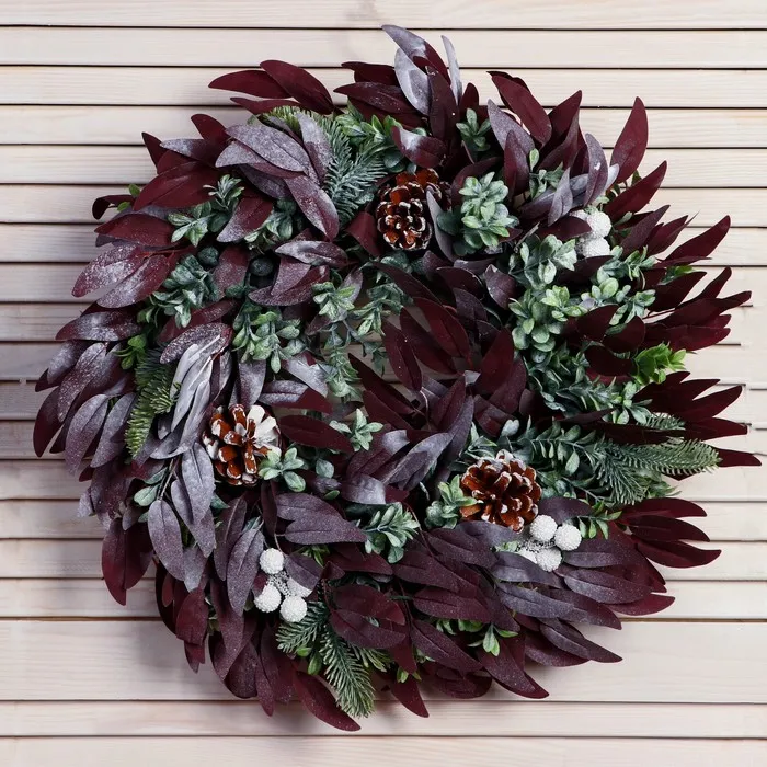 Новогодний венок d- 38 см «Зимнее волшебство. Уютная сказка» на дверь, на стену, декор листья, шишки, зелень — Характеристики