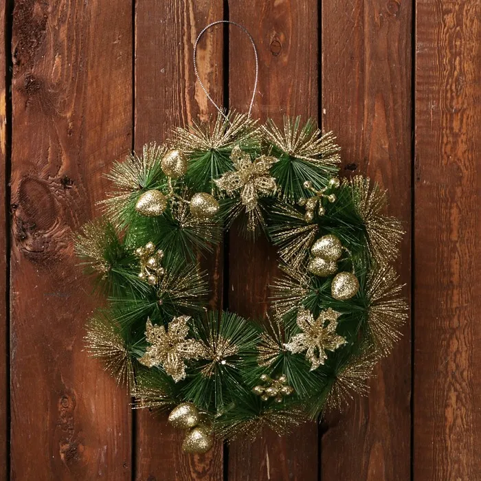 Новогодний венок d=20 см «Зимнее волшебство. Золотые цветы на зелёном» — Характеристики