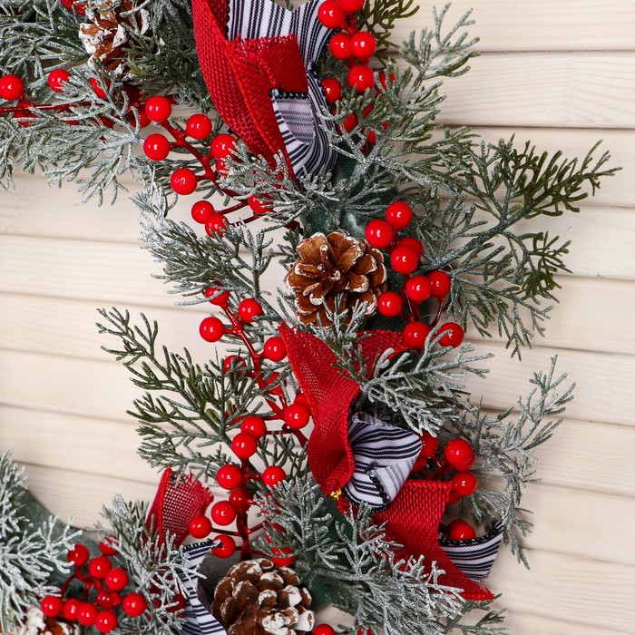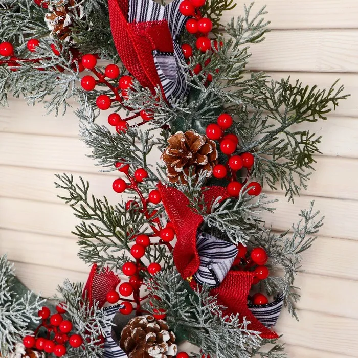Новогодний венок d=40 см «Зимнее волшебство. Уютная сказка» декор полосатые ленты, шишки — Характеристики