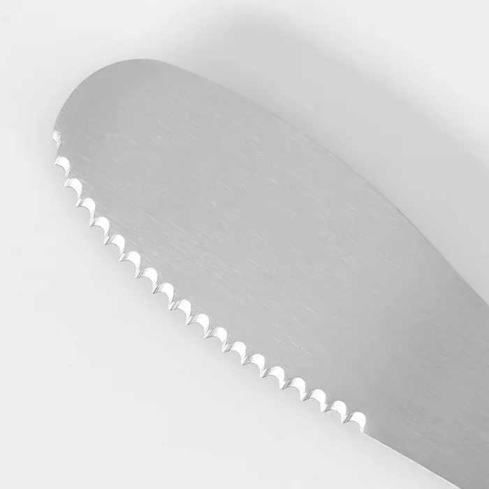 Нож кухонный для масла - это незаменимый инструмент на кухне для тех, кто любит готовить блюда с использованием масла. Этот нож изготовлен из высококачественной нержавеющей стали, которая обеспечивает его прочность и долговечность. Длина ножа позволяет легко и быстро намазывать масло на хлеб или другие продукты.