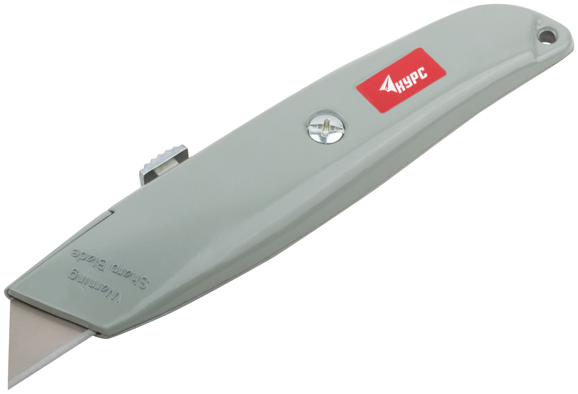 Нож выполнен с металлическим корпусом, обеспечивающим долговечность и надежность в работе. Лезвие из инструментальной стали имеет трапециевидную форму, что позволяет легко прорезать даже плотные материалы.