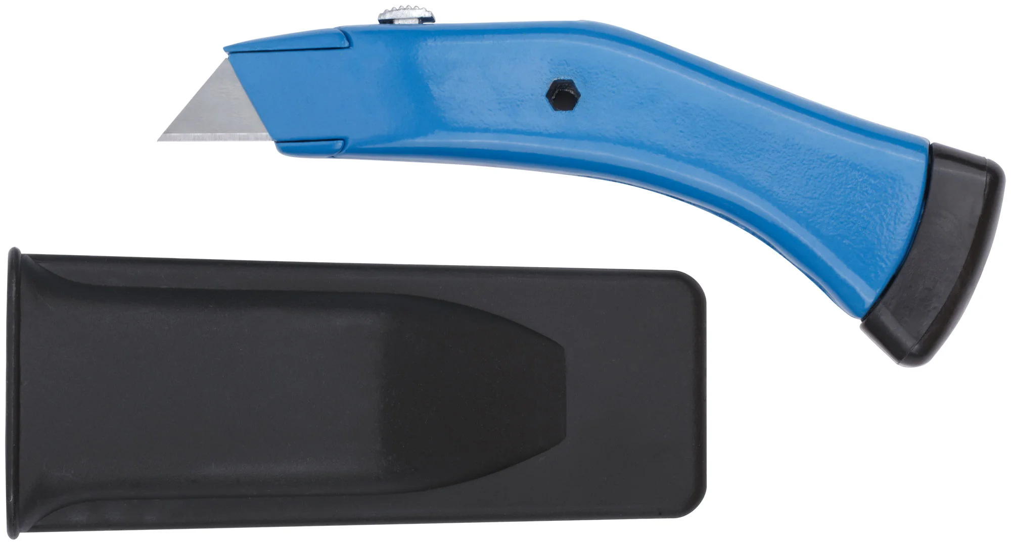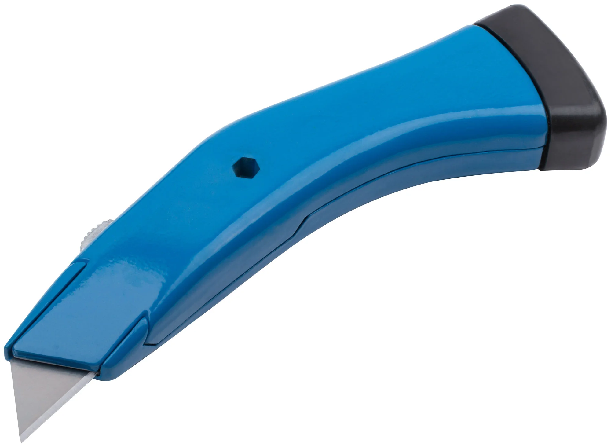 Нож оснащён металлическим корпусом, который обеспечивает долговечность и устойчивость к износу. Лезвие трапециевидной формы выполнено из инструментальной стали, что даёт возможность работать с самыми разнообразными материалами.