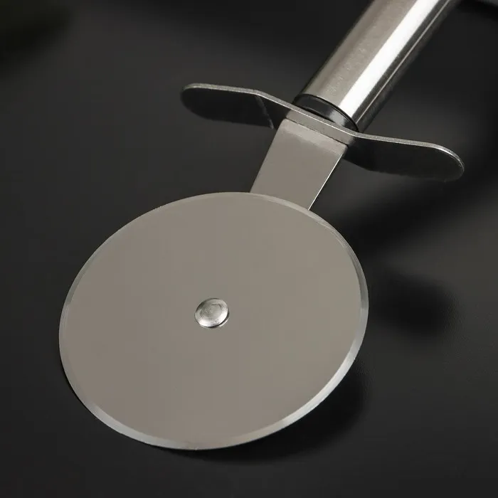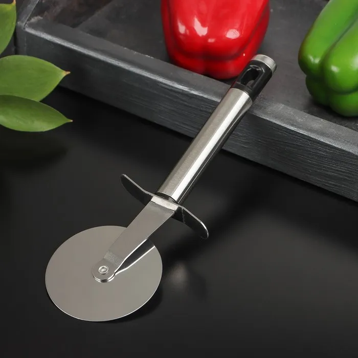 Нож для пиццы — универсальный кухонный инструмент, который не только легко разрезает готовую выпечку, но и помогает поделить на слайсы липкое тесто. Нож имеет эргономичную форму ручки и острое круглое лезвие. Колесо, прикреплённое к рукояти, продавливает продукт, а не разрезает его в отличие от классического ножа. Благодаря такому способу тесто разрезается, а начинка остается на месте.