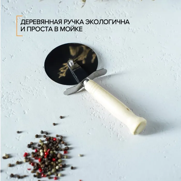 Нож для пиццы — универсальный кухонный инструмент, который не только легко разрезает готовую выпечку, но и помогает поделить на слайсы липкое тесто. Нож имеет эргономичную форму ручки и острое круглое лезвие. Колесо, прикреплённое к рукояти, продавливает продукт, а не разрезает его в отличие от классического ножа. Благодаря такому способу тесто разрезается, а начинка остается на месте.