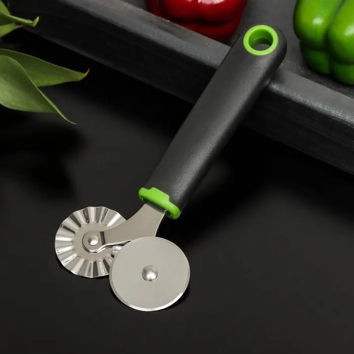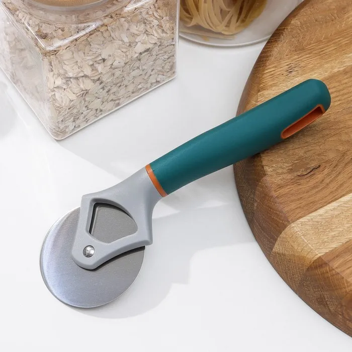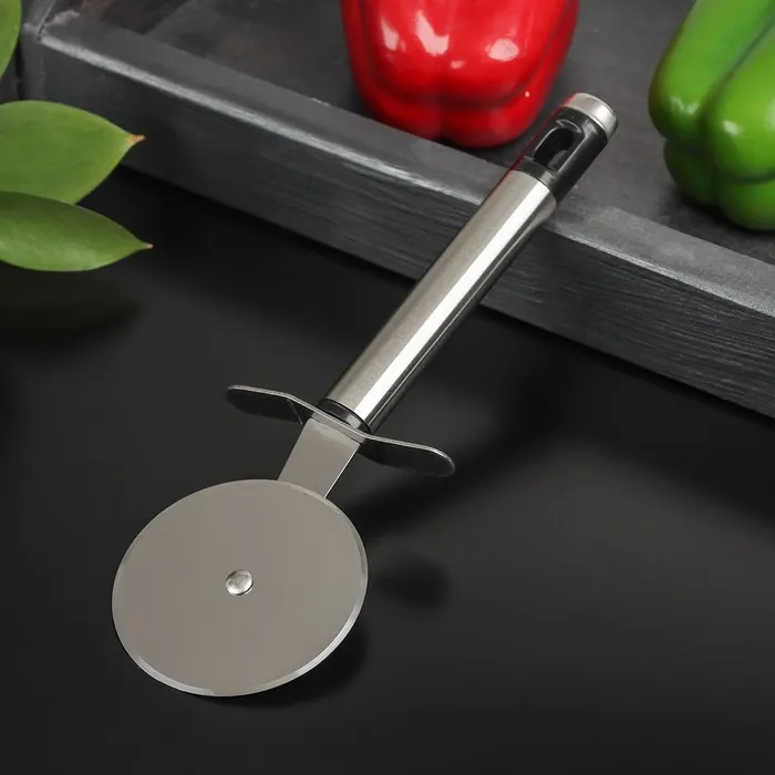 Нож для пиццы — универсальный кухонный инструмент, который не только легко разрезает готовую выпечку, но и помогает поделить на слайсы липкое тесто. Нож имеет эргономичную форму ручки и острое круглое лезвие. Колесо, прикреплённое к рукояти, продавливает продукт, а не разрезает его в отличие от классического ножа. Благодаря такому способу тесто разрезается, а начинка остается на месте.
