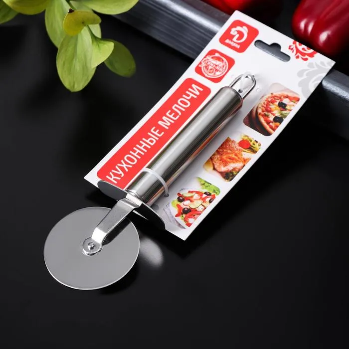 Нож для пиццы — универсальный кухонный инструмент, который не только легко разрезает готовую выпечку, но и помогает поделить на слайсы липкое тесто. Нож имеет эргономичную форму ручки и острое круглое лезвие. Колесо, прикреплённое к рукояти, продавливает продукт, а не разрезает его в отличие от классического ножа. Благодаря такому способу тесто разрезается, а начинка остается на месте.