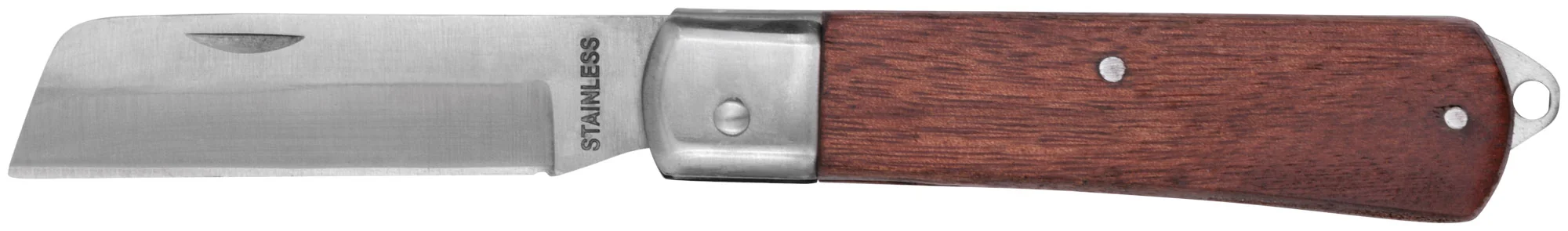Нож оснащен качественным лезвием из нержавеющей стали, обеспечивающим долгий срок службы и устойчивость к коррозии. Деревянная ручка придает инструменту классический вид и обеспечивает удобный хват, позволяя работать долго без усталости. Заточенная часть лезвия не примыкает плотно к металлическому стопору, что способствует дольшему сохранению остроты.