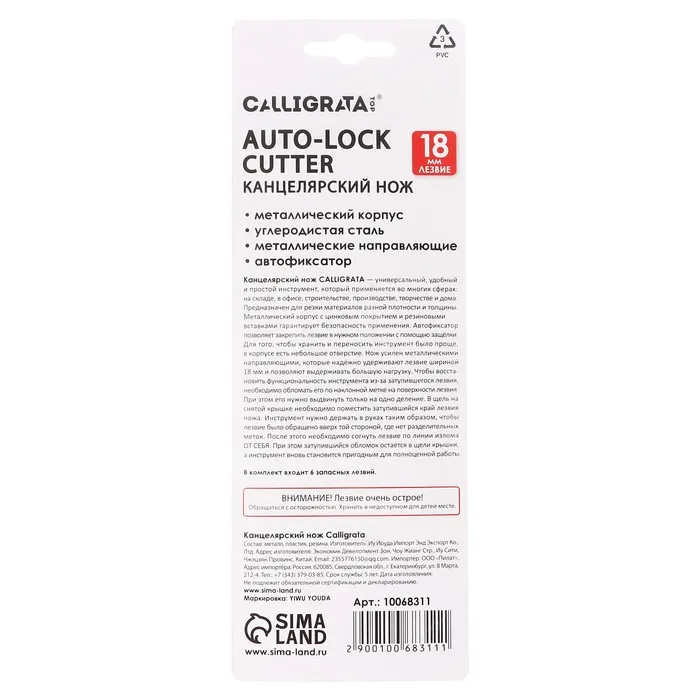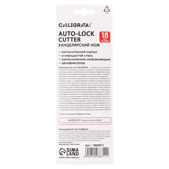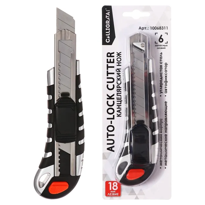 Оптимальный выбор для офиса и мастерской — это надежный канцелярский нож со сменными лезвиями. Конструкция модели с лезвием шириной 18 мм обеспечивает точный и безопасный рез. Корпус из цинкового сплава придаёт инструменту долговечность и устойчивость к износу. В комплекте представлено сразу шесть лезвий, что продлевает срок службы ножа и упрощает его использование для различных задач.