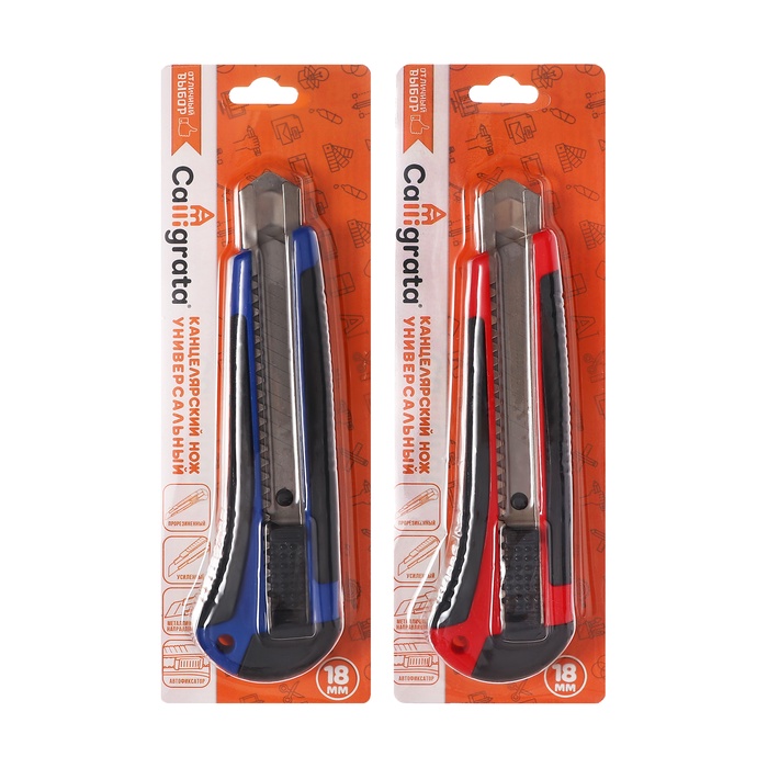 Нож канцелярский 18 мм пластик с мет., направляющ, фиксатор, прорезиненный МИКС в блистере — Характеристики