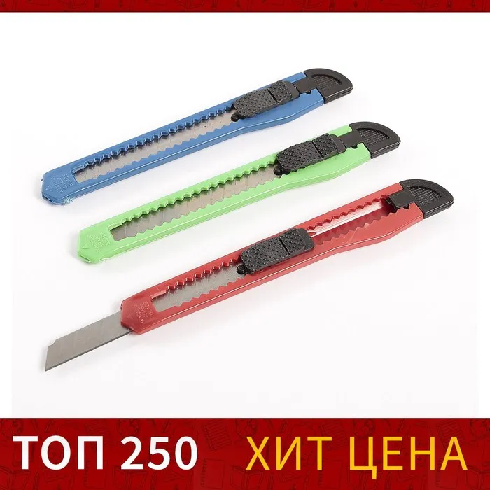 Легкий корпус с металлическими направляющими надежно удерживает остро отточенное лезвие стандартной ширины.По мере использования отработанные концы лезвия просто отламываются.Дизайн корпуса ножа эргономичный.Резиновые края ручки предотвращают скольжение пальцев, исключают их травмирование.Для удобства хранения имеется отверстие для подвеса.Яркая расцветка выделяет инструмент среди других подобных, нож упакован в блистер с европодвесом.Канцелярский нож - изделие, способное выручить в самых неожиданных ситуациях, а потому должно присутствовать в каждом офисном или домашнем наборе!