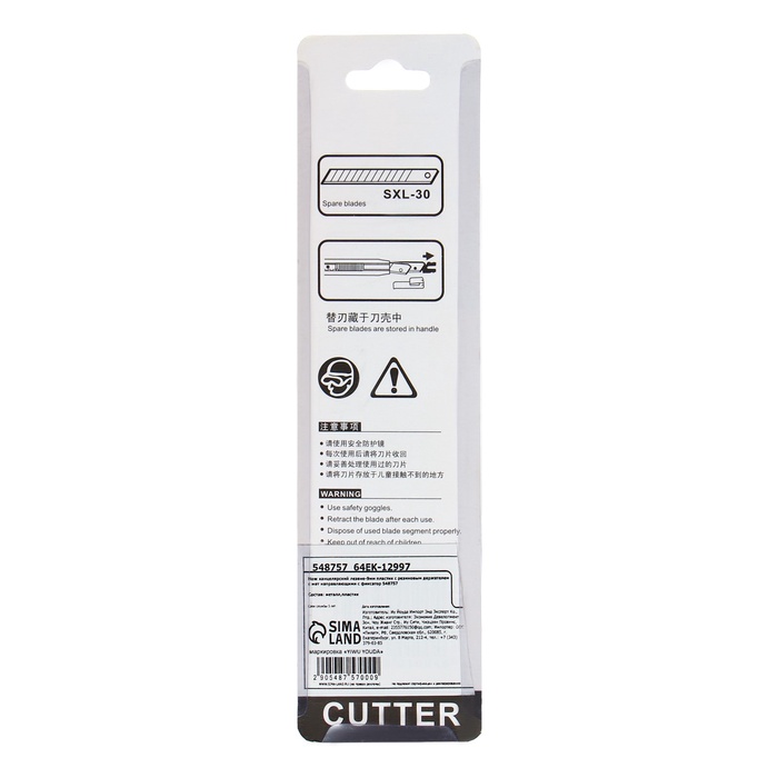 Легкий корпус с металлическими направляющими надежно удерживает остро отточенное лезвие стандартной ширины.По мере использования отработанные концы лезвия просто отламываются.Дизайн корпуса ножа эргономичный.Резиновые края ручки предотвращают скольжение пальцев, исключают их травмирование.Для удобства хранения имеется отверстие для подвеса.Яркая расцветка выделяет инструмент среди других подобных, нож упакован в блистер с европодвесом.Канцелярский нож - изделие, способное выручить в самых неожиданных ситуациях, а потому должно присутствовать в каждом офисном или домашнем наборе!