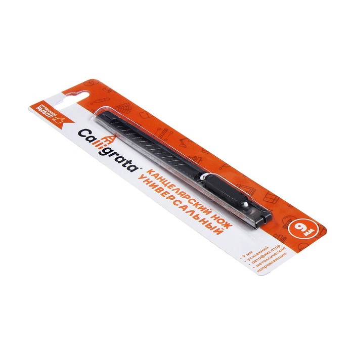 Легкий корпус с металлическими направляющими надежно удерживает остро отточенное лезвие стандартной ширины.По мере использования отработанные концы лезвия просто отламываются.Дизайн корпуса ножа эргономичный.Резиновые края ручки предотвращают скольжение пальцев, исключают их травмирование.Для удобства хранения имеется отверстие для подвеса.Яркая расцветка выделяет инструмент среди других подобных, нож упакован в блистер с европодвесом.Канцелярский нож - изделие, способное выручить в самых неожиданных ситуациях, а потому должно присутствовать в каждом офисном или домашнем наборе!