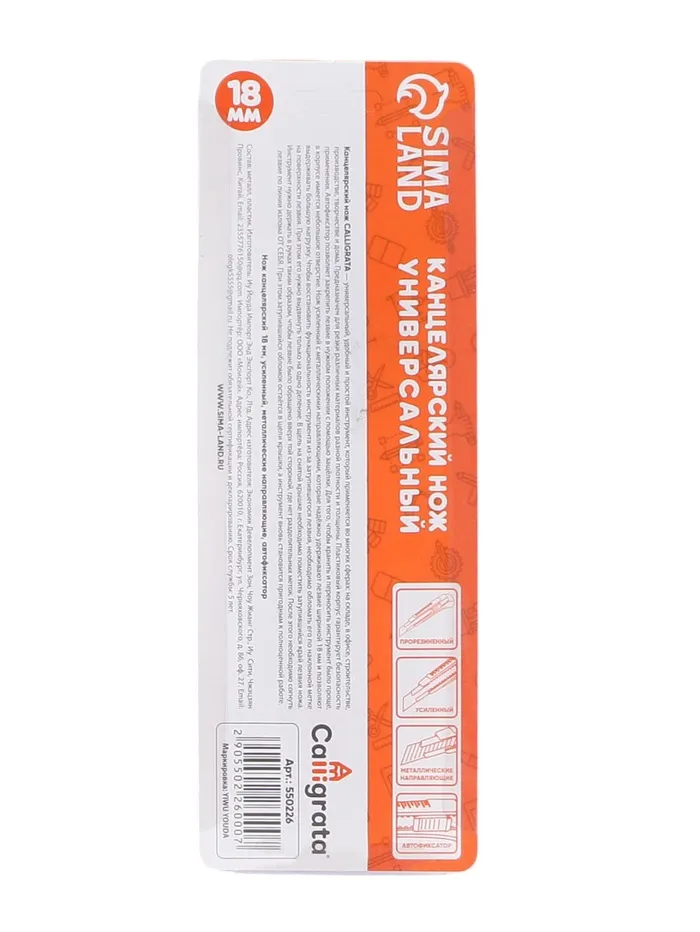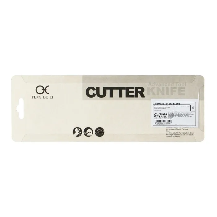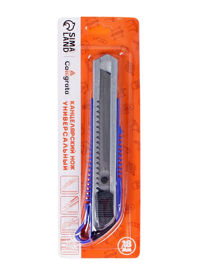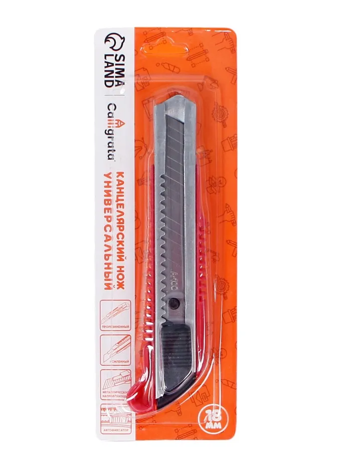 Легкий корпус с металлическими направляющими надежно удерживает остро отточенное лезвие стандартной ширины.По мере использования отработанные концы лезвия просто отламываются.Дизайн корпуса ножа эргономичный.Резиновые края ручки предотвращают скольжение пальцев, исключают их травмирование.Для удобства хранения имеется отверстие для подвеса.Яркая расцветка выделяет инструмент среди других подобных, нож упакован в блистер с европодвесом.Канцелярский нож - изделие, способное выручить в самых неожиданных ситуациях, а потому должно присутствовать в каждом офисном или домашнем наборе!