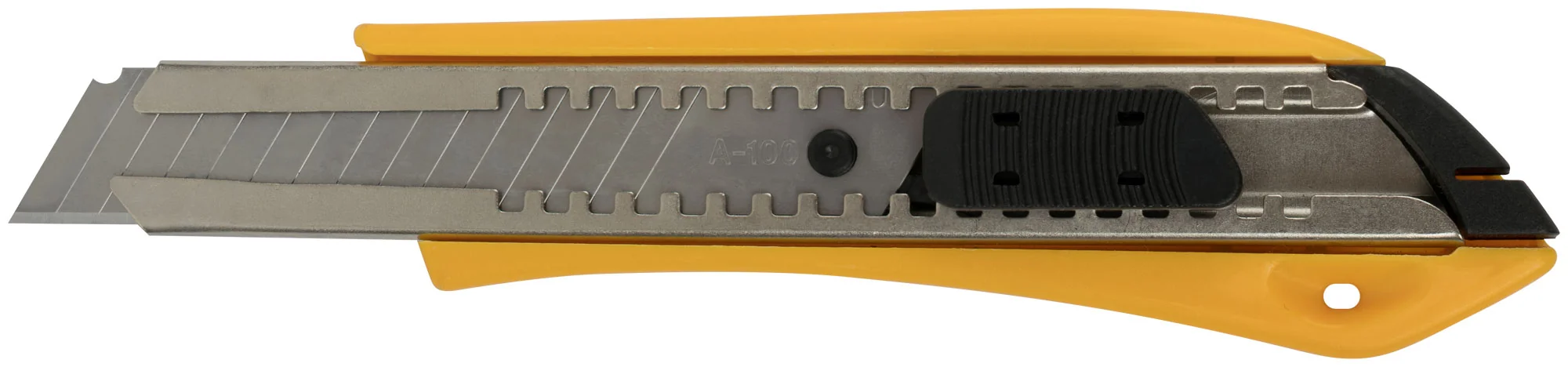 Конструкция ножа включает в себя прочный корпус из ударопрочного ABS пластика и лезвие из высокоуглеродистой стали. Металлическая направляющая с двусторонней автофиксацией обеспечивает надежную фиксацию лезвия, что делает инструмент безопасным в использовании.